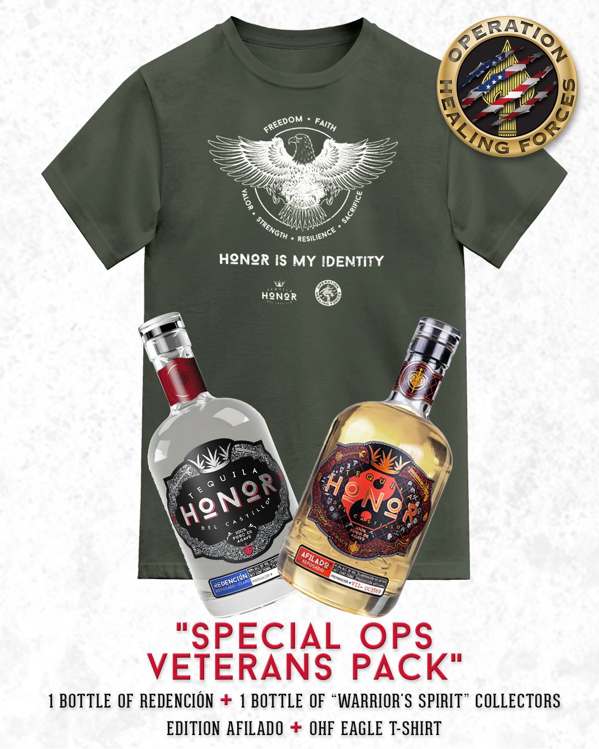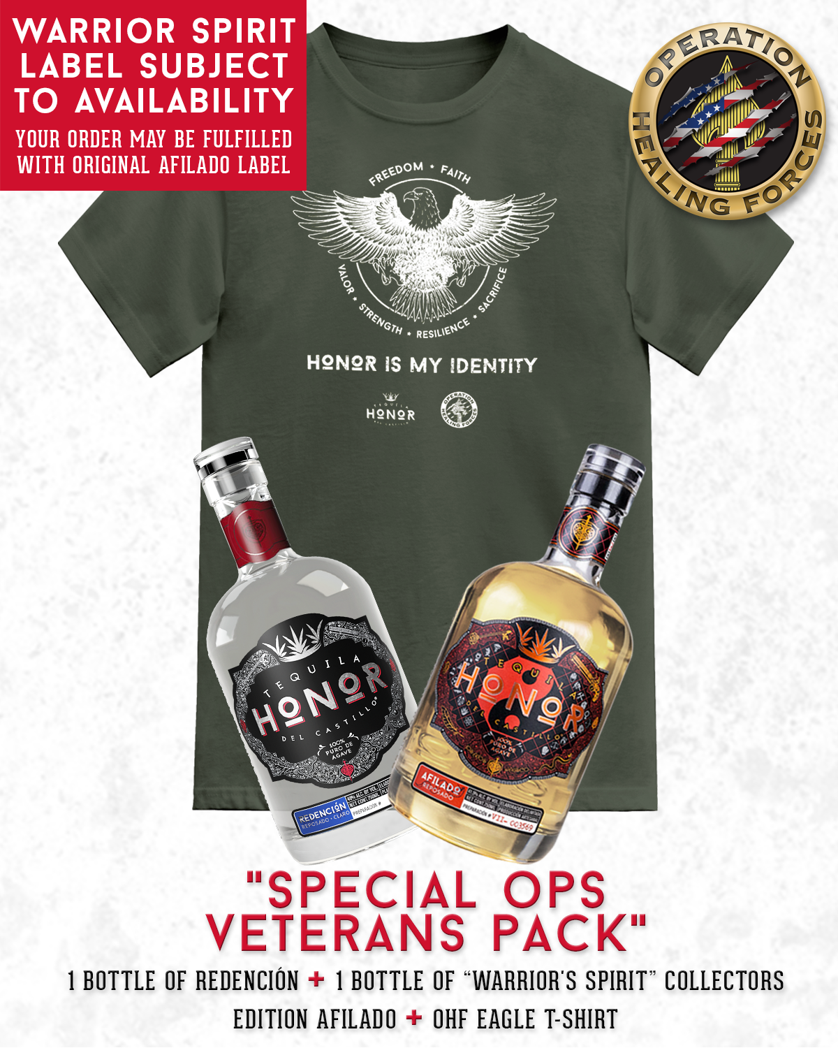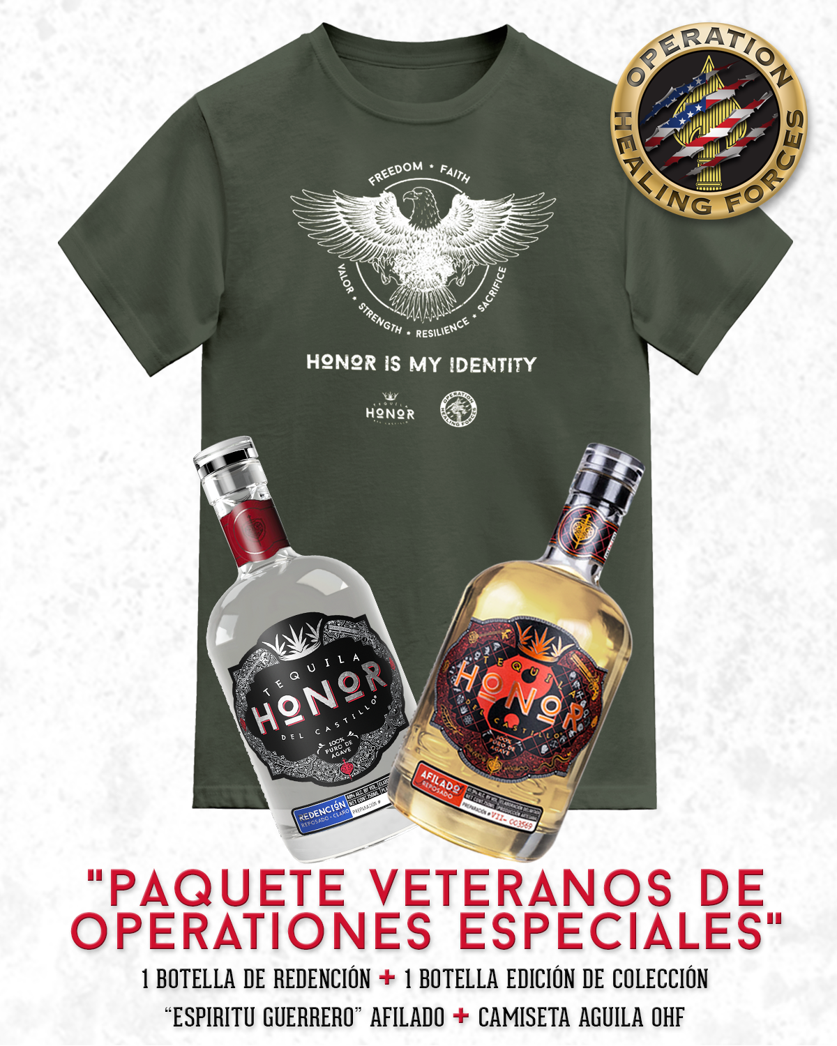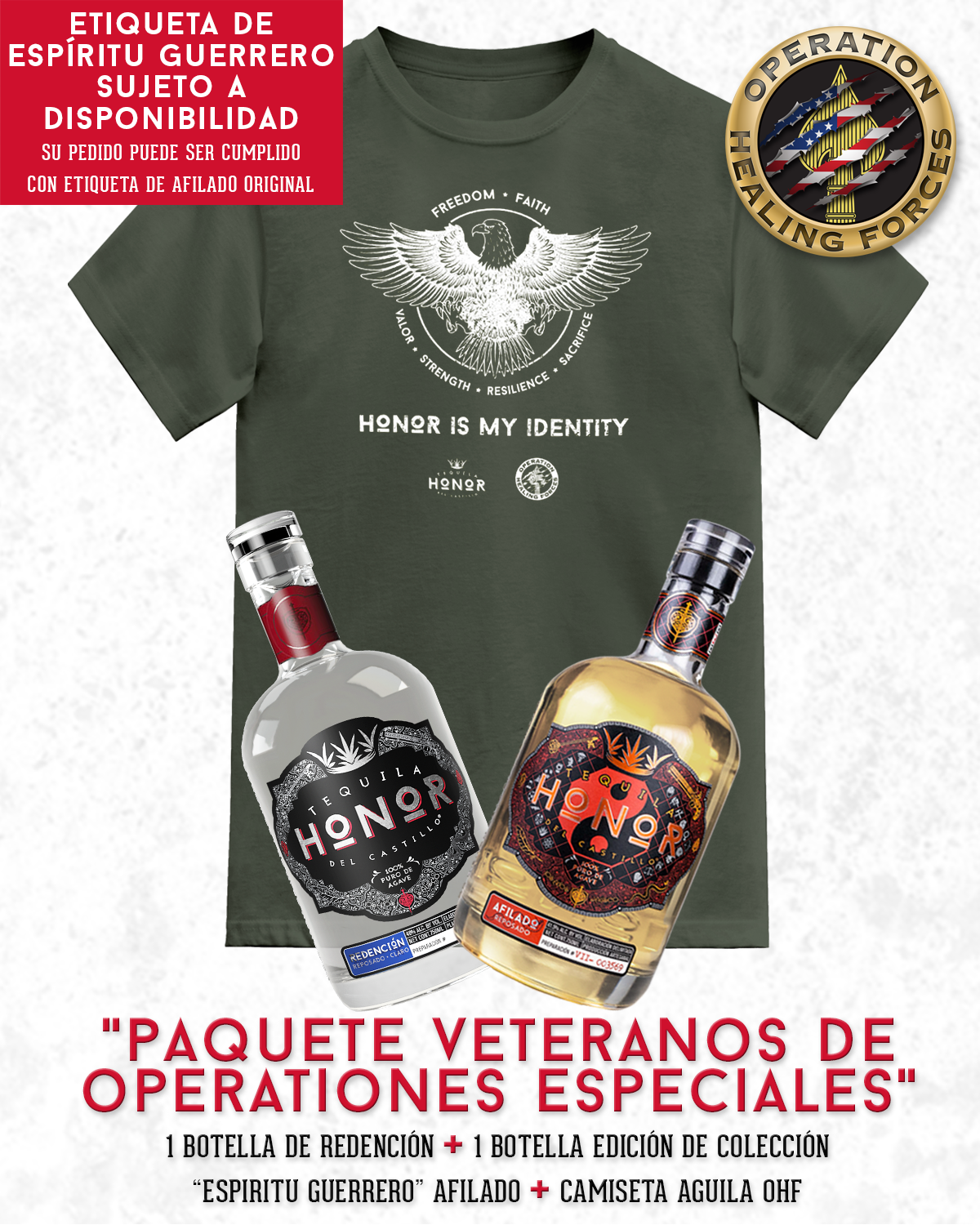 Compra el paquete de 1 botella de Reflexión Blanco y 1 botella de Tequila Honor Afilado Edición de Colección y recibe una camiseta de colaboración especial con Operation Healing Forces. Partes de las ganancias benefician a los veteranos. Obtenga el suyo hoy. El honor está en tus manos.