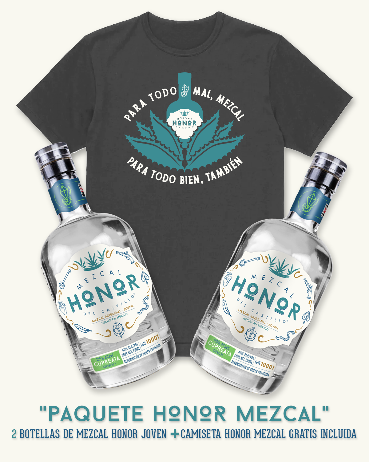 INCLUYE: 2 botellas de Honor Mezcal (Joven) y Camiseta de Mezcal