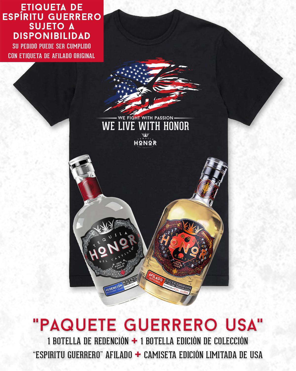 INCLUYE: Tequila Honor Redención Reposado Claro / Tequila Honor Afilado Edición de Colección Espíritu Guerrero y Camiseta Edición Limitada “USA GUERRERO/WARRIOR CUP”*